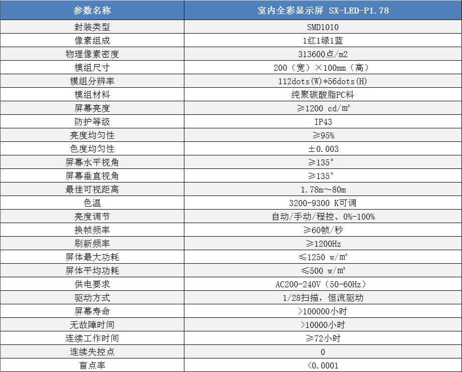 P1.78室內(nèi)小間距高清全彩LED顯示屏技術(shù)參數(shù):