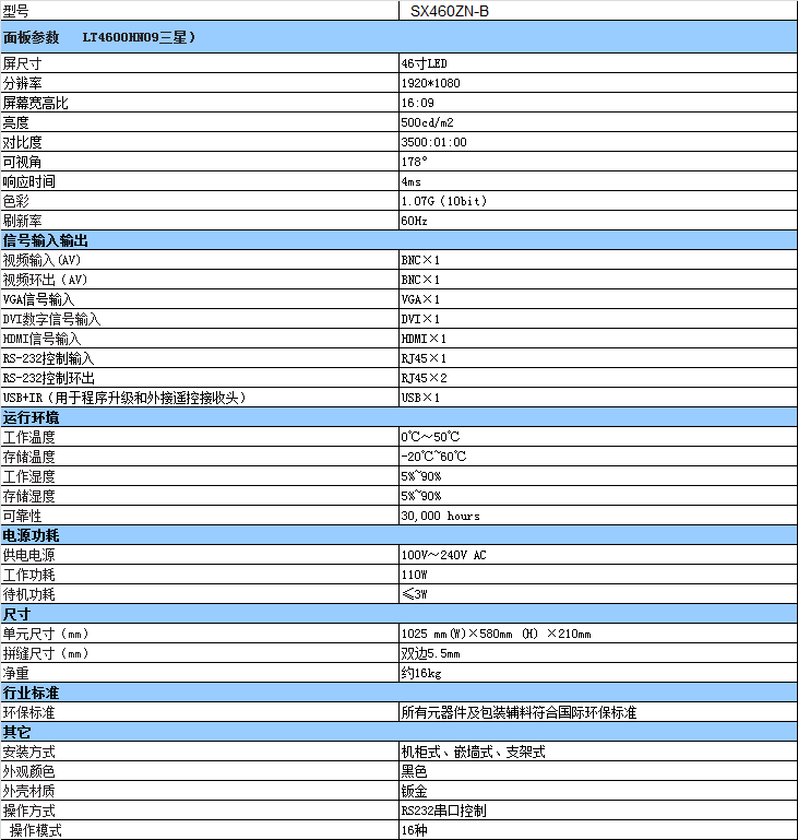 46寸3.5mm液晶拼接屏技術參數: