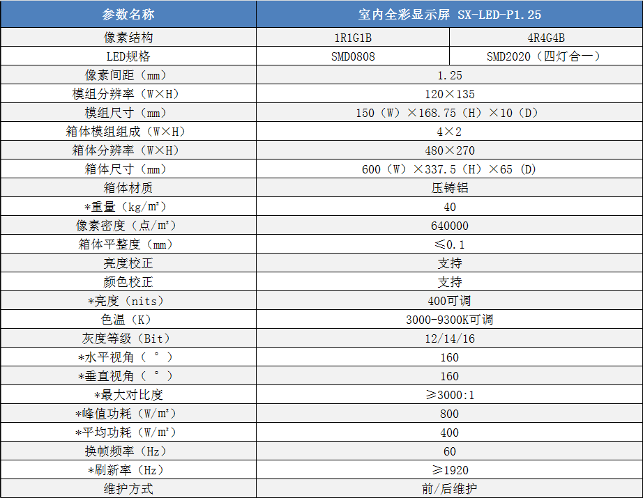 P1.25室內(nèi)小間距高清全彩LED顯示屏技術(shù)參數(shù):